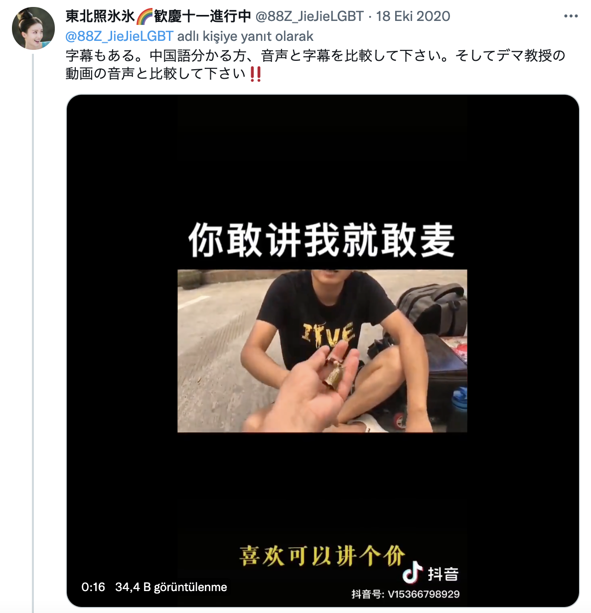 Videoposnetek je uporabnik delil s kodo "v15366798929" v aplikaciji Douyin. Besedilo lahko prevedete s pomočjo iskalnika slik Yandex. "你敢讲我就敢麦" besedilo na sliki se glasi: "Če si upaš govoriti, si ne upam jesti pšenice". Poleg tega je mogoče razumeti, da gre za pogovor iz kupčije, če podnapise v videoposnetku prevedemo s pomočjo orodja Google Lens. Na tej točki si lahko z orodjem za urejanje zvoka Audacity pomagamo pri primerjavi teh dveh zvočnih posnetkov in ugotovimo, da sta si podobna. Različne videoposnetke z enakim zvokom lahko najdete na spletnem mestu Twitter.