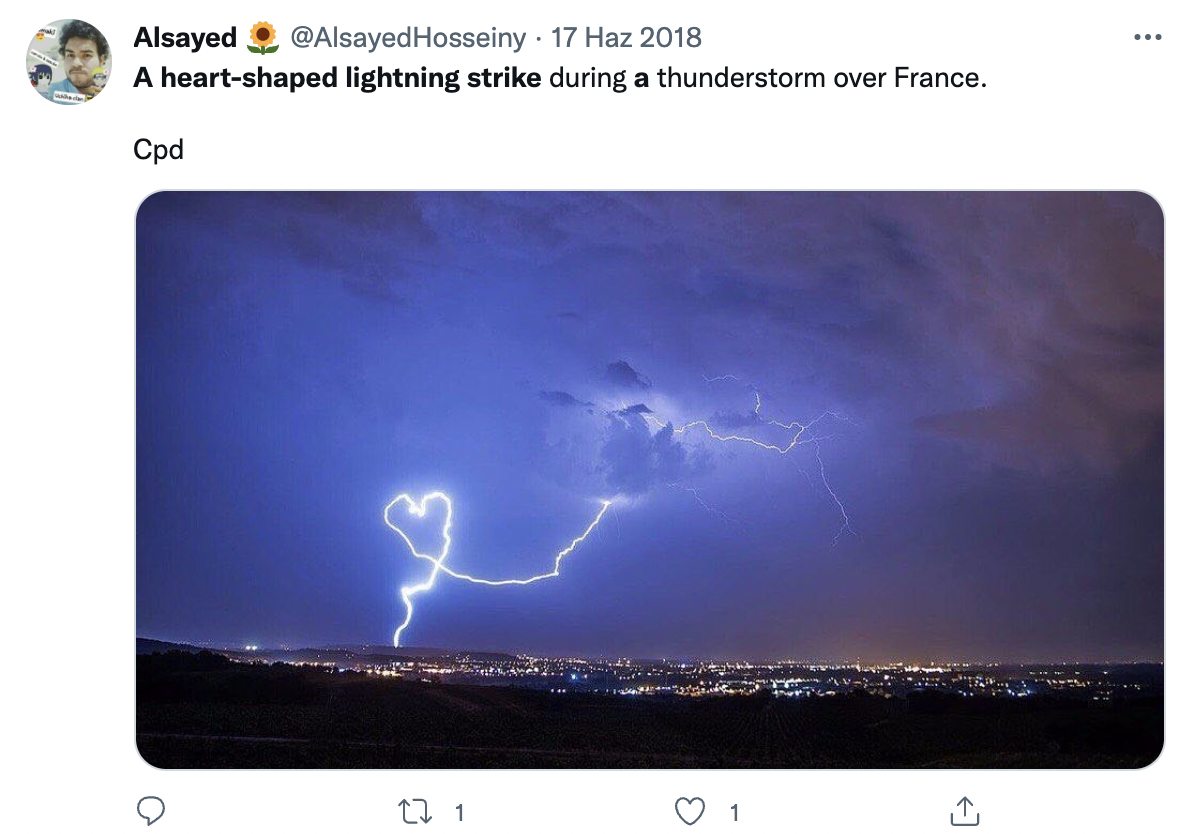 Trditev: Fotografija, ki prikazuje udarec strele v obliki srca iz Francije. Povezava na trditev: https://archive.is/kQKTe Exercise 1 Verification Note: You should say "it is true" (for question 2) about the claim based on the fact-checking you've done. The following can be done for fact-checking:
