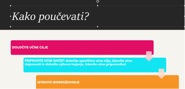 Nasvet: Način izvedbe ima velik vpliv na izvedbo poučevanja in ima svoje posebnosti. Poskrbite, da boste dejavnosti prilagodili glede na način izvedbe. Če usposabljanje izvajate prek spleta, razmislite, kako boste ohranili motivacijo, kdaj boste naredili odmore, kako boste zagotovili, da bodo udeleženci aktivni (npr. jih razdelite v ločene spletne sobe za delo v skupinah ali parih). Pri neposrednem usposabljanju preverite, kako velik je prostor za poučevanje in kakšno opremo ima.