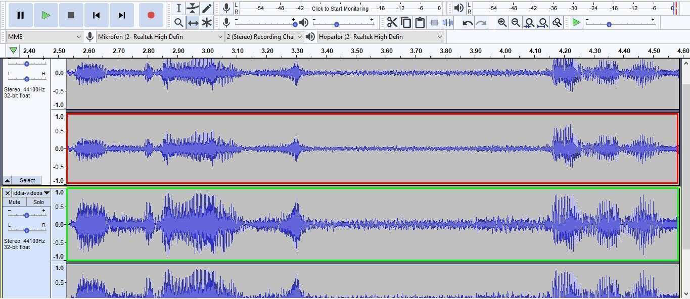 (Област означена црвеном бојом су звучни таласи оригиналног видео-записа, област означена зеленом бојом је звук из спорног видео-записа)