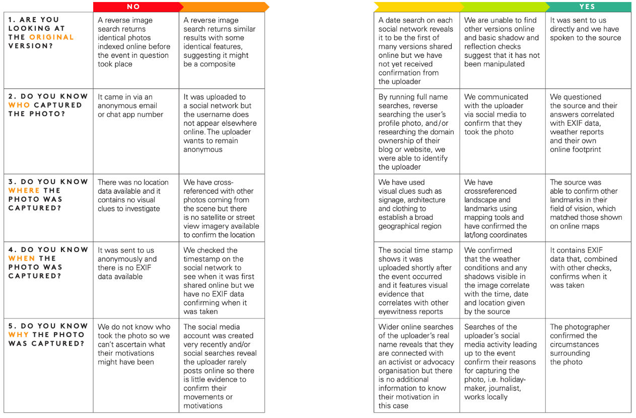 Приликом верификације фотографија фокусирајте се на следећих пет питања како бисте дошли до одговора (Urbani, 2019):