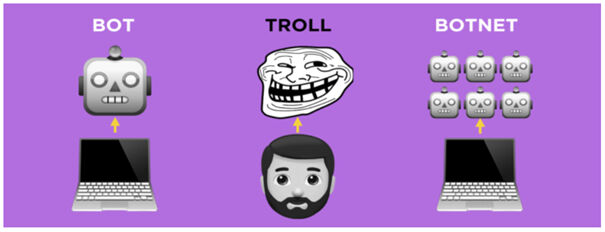 Bot, gerçek bir kişi yerine bir algoritma tarafından çalıştırılan otomatik bir sosyal medya hesabıdır. Başka bir deyişle, bir bot insan müdahalesi olmadan gönderiler yapmak için tasarlanmıştır. Üç temel bot göstergesi, anonimlik, yüksek etkinlik seviyesi ve belirli kullanıcıların, konuların veya etiketlerin büyütülmesidir (Barojan, November 5, 2018). Gerçek Twitter kullanıcıları genellikle çeşitli konular hakkında günde birkaç kez paylaşımda bulunurken, botlar günde yüzlerce kez ve genellikle yalnızca belirli bir konuda tweet atarlar. Orijinal bir şey oluşturmak yerine içeriği yeniden yayınlama olasılıkları daha yüksektir (Klepper, February 7, 2020). Botlar, farklı sosyal medya platformlarının algoritmalarını etkileyebilecek etiketler kullanabilir ve içerik yayınlayabilirler (Stronder, May 21, 2020).