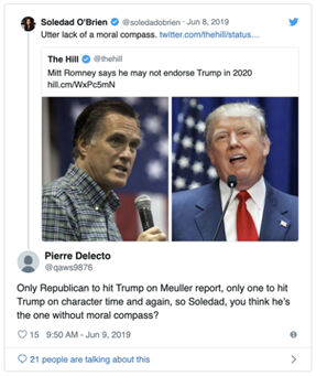 ABD'li Utah Senatörü Mitt Romney, eleştirilere karşı kendisini savunmak amacıyla "Pierre Delecto" adı altında gizli bir Twitter hesabı kullandığını kabul etmiştir (Klepper, February 7, 2020).