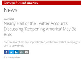 Young, V. A. (May 27, 2020). Nearly half of the Twitter accounts discussing 'reopening America' may be bots. Carnegie Mellon University News.