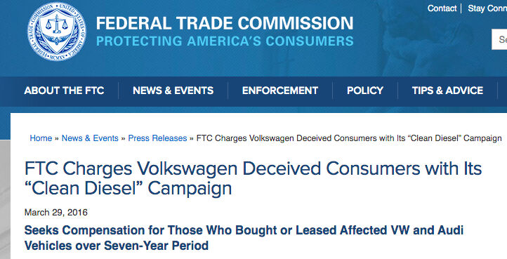 Yukarıda belirtilen reklamın nasıl güvenilmez (ve bu durumda kasıtlı olarak yanıltıcı) bilgi olarak değerlendirilebileceğinin bir örneği hem Federal Ticaret Komisyonu'nun (ABD) hem de Çevre Koruma Ajansı'nın (ABD) Volkswagen'i kasıtlı olarak müşterileri aldatmakla suçlayan haber duyurusunda (news release) açıklanmıştır: