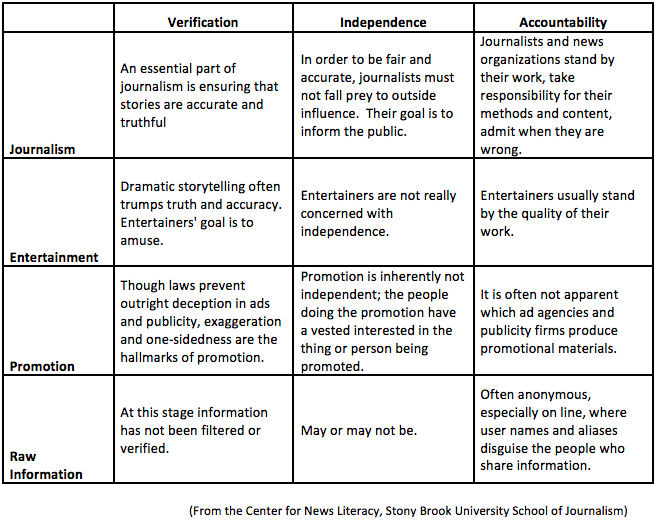 Farklı medya türleri aracılığıyla iletilen bilgiler “güvenilir” olmalıdır. Güvenilir bilginin üç ana özelliği vardır: Doğrulama, Bağımsızlık ve Hesap Verebilirlik (Digital Resource Center, 2021). Hornik, Anzalone & Spikes (2018, s. 192) farklı bilgi türlerini ayırt etmeye yardımcı olmak için tasarlanmış bir haber okuryazarlığı kavramı olarak “bilgi mahallelerini” (information neighborhoods) kullanır: Habercilik (Journalism), Eğlence (Entertainment), Reklâm (Advertising), Promosyon (Promotion), Propaganda ve Ham Bilgi (Raw Information) (bkz. Tablo 1). Haber veya Habercilik (The News, or Journalism) mahallesi, Doğrulama, Bağımsızlık ve Hesap Verebilirliğe sahip tek mahalledir. Haber, Doğrulama, Bağımsızlık ve Hesap Verebilirliği içeren bir habercilik sürecinden (journalistic process) geçmelidir. Diğer medya içeriklerinin çoğu bu üç ana özelliğe sahip değildir ve bu nedenle, bazen, farklı medya içerikleri arasındaki çizgiler bulanık olabilir.