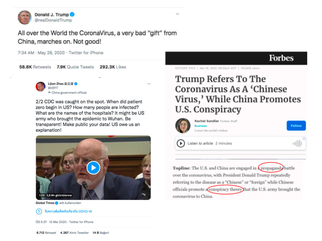 Aşağıdaki tweetler, iki karşıt tarafın birbirine karşı propagandayı nasıl kullanabileceğini göstermektedir. Propagandanın tüm anahtar kelimelerini içermektedirler: yardım/zarar, kasıtlı olarak/kasten, geniş çapta yayılmış, önyargılı, yanıltıcı veya ideolojik.