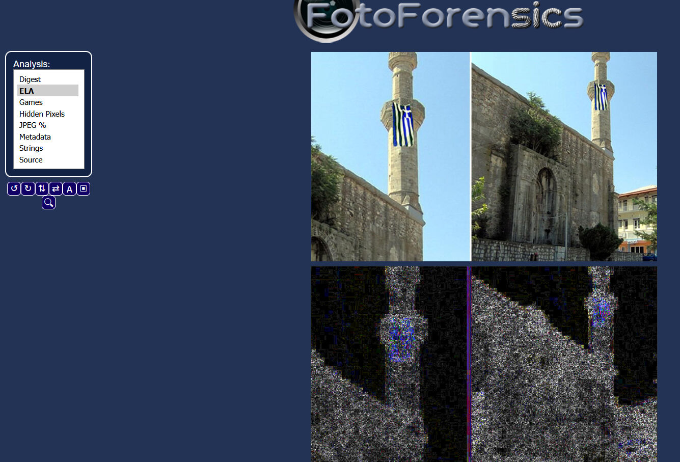 Foto Forensics: Bu araç montajlı bir görseli/görüntüyü anlamak için kullanılabilir. Bir görüntünün EXIF’inin (üstverilerinin) bulunmasını ve görüntünün hata düzeyi analizinin (ELA) görülmesini sağlar. Bu araç aynı zamanda, kameranın modeli, görüntünün zaman damgası ve orijinal görüntünün boyutları gibi bilgileri de sağlayabilmektedir (Silverman ve Tsubaki, t.y., s. 99).