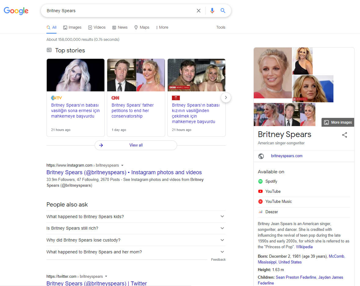 Sonuç listesindeki sosyal medya hesabına tıklandığında hesabın mavi tik sahibi olduğu görülüyor. Yani, doğrulanmış bir hesap olduğu ve Britney Spears’a ait olduğu anlaşılıyor. Ayrıca kişi ile ilgili bir web bağlantısı, konum bilgisi, hesap oluşturma tarihi gibi bazı ek bilgiler de bulunmaktadır.