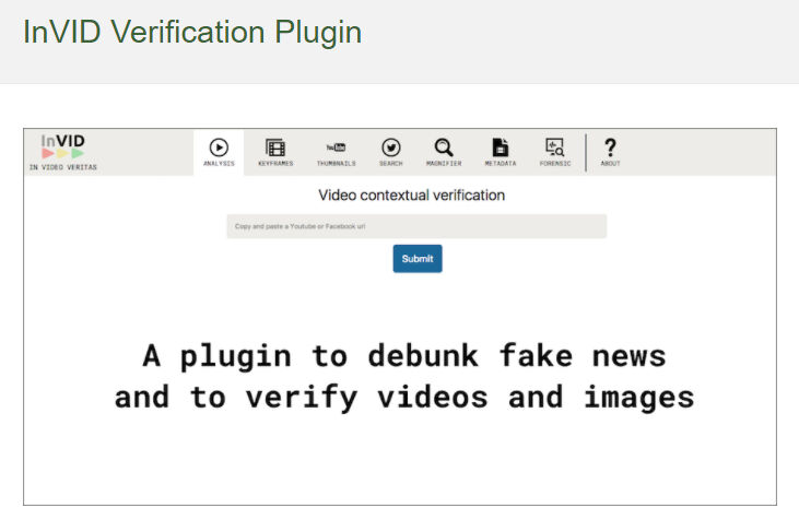 InVID ise videoları karelere bölmeye, bu kareleri tersine görsel arama yöntemiyle birden fazla arama motorunda aramayı, kareleri ve görselleri yakınlaştırarak incelemeyi ve durağan görüntüleri analiz etmek için çeşitli filtreler uygulamayı sağlayan bir internet tarayıcı eklentisidir (Gregory, 2020). Arama çubuğuna ilgili bir bağlantı yapıştırıp arama yaptığınızda, videonun önizleme görüntüsü belirir. Bu görüntü tersine görsel arama araçları ile aranarak videonun başka nerede yayınlanmış olabileceği belirlenebilir (Lytvynenko, 2020).