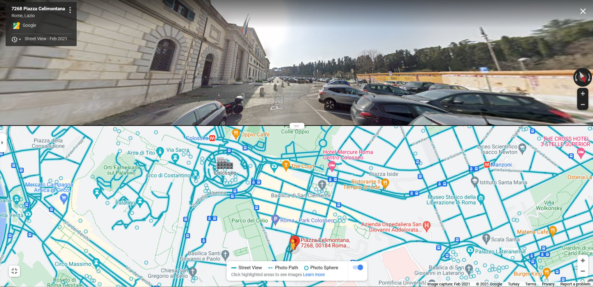 Örnek: Diyelim ki rastladığımız bir haberde İtalya’da Kolezyum yakınlarındaki Celimontana Meydanı’nda meydana gelen bir olayla ilgili olduğu iddia edilen bir görsel veya video var. Haberdeki konum bilgisini kontrol etmek istediğimizde Google Street View’i kullanabiliriz.