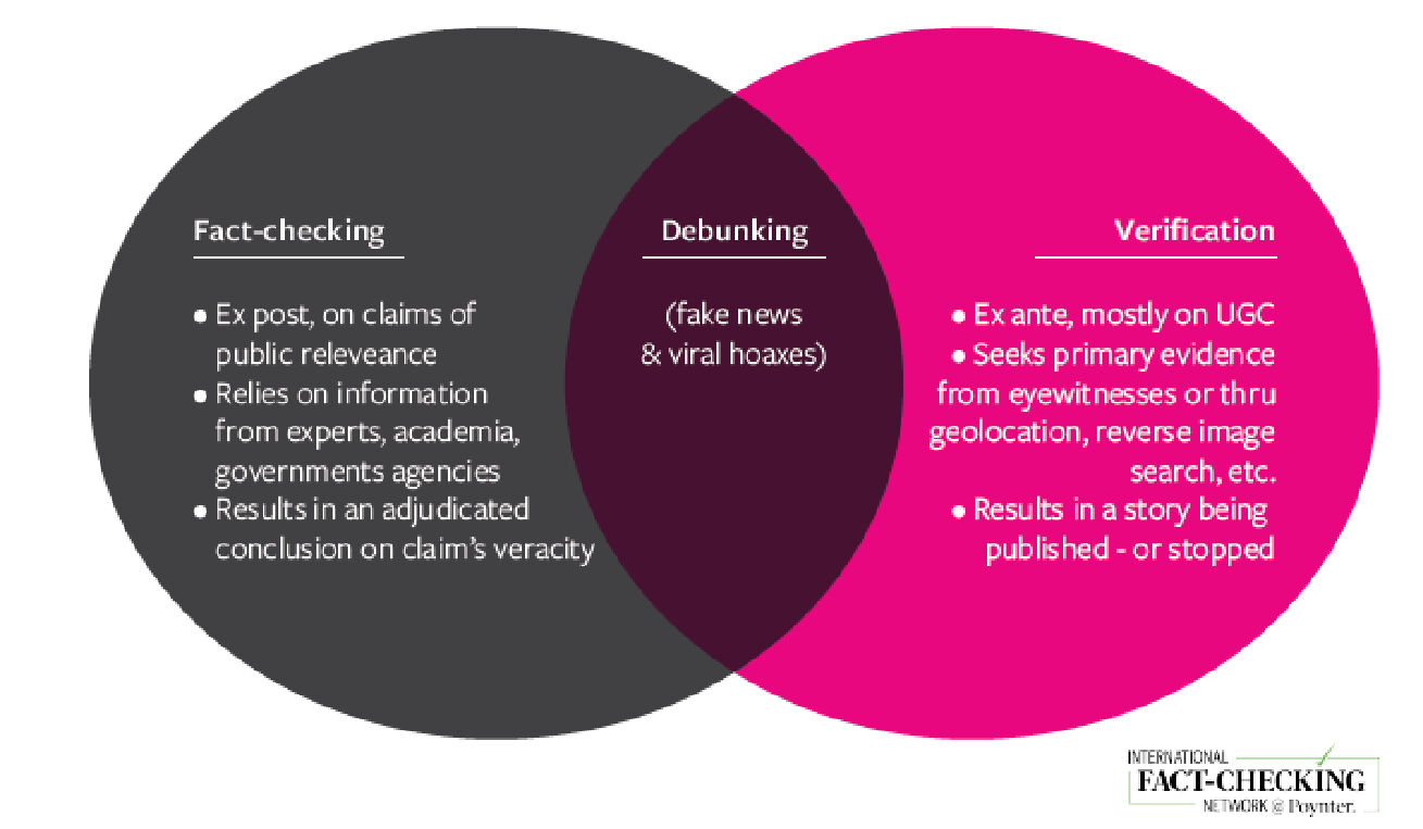 Doğrulama, bir haberin “haber” haline gelmeden önce doğruluğunu değerlendiren bir süreçtir. Özellikle kullanıcı tarafından oluşturulan içeriğe odaklanır. İddiaya ait kaynağın güvenilirliğine daha fazla dikkat eder (Mantzarlis, 2015, 2018). Doğruluk kontrolü ise, yayınlanmış olan ve kamuya açık bir iddiayı güvenilir ve orijinal kaynaklarla karşılaştıran bir süreç olup, iddianın mantığına, tutarlılığına ve bağlamına da odaklanmaktadır. (Mantzarlis, 2015). Aslında, doğruluk kontrolünün önemli ölçüde geleneksel yayıncılıktan siyasi gazetecilik alanına doğru kaydığı söylenebilir. Başka bir deyişle, mevcut anlamıyla doğruluk kontrolü, politikacıların ve diğer kamuya mal olmuş kişilerin ifadelerini kontrol etmeye giderek daha fazla odaklanmaktadır (Silverman, 2020b).