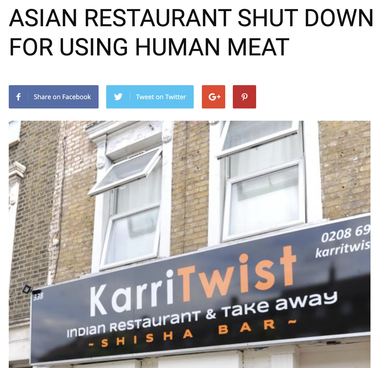 Restoran sahibi Shrina Begum kendisini insan eti satmakla suçlayan telefonların sebebini anlayamayıp söylentileri araştırmaya karar verdiğinde Channel23news.com adlı bir web sitenin, Karri Twist isimli restoranın insan eti satarken yakalandığını ve sahibinin tutuklandığını iddia eden bir haber yayınladığını farketti.