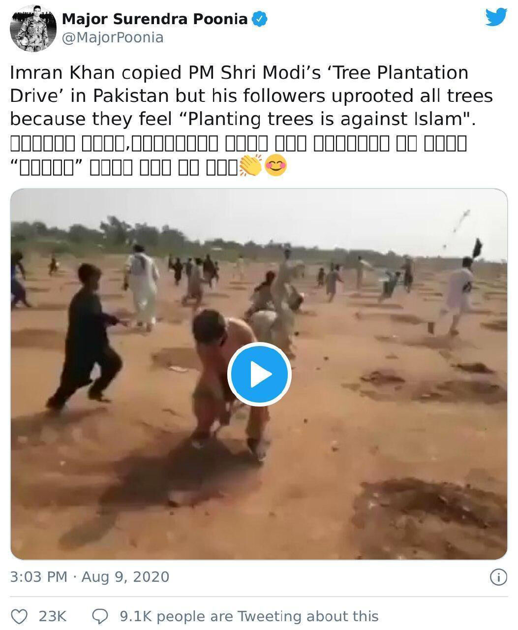 Hindistan ve Pakistan arasındaki gerginlik devam ederken, sosyal medyada dolaşıma giren çeşitli iddialar iki ülke arasındaki tansiyondan beslenmeyi sürdürüyor. 8 Ağustos 2021'de, bir videonun Pakistan’da, İslam’a aykırı olduğu gerekçesiyle fidan söküldüğünü gösterdiği iddia edildi. Politikacıların ve tanınmış kişilerin doğrulanmış Twitter hesapları aracılığıyla yaptığı paylaşımlar iddianın hızla yayılmasına neden oldu. Hindistan'daki iki büyük siyasi partiden biri olan Bharatiya Janata üyesi ve eski ordu komutanı Surendra Punia videoyu tweetleyenler arasındaydı.