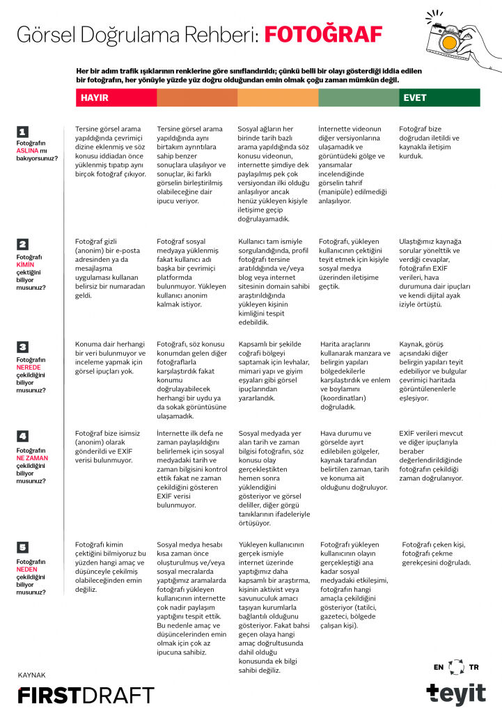 Fotoğrafların doğrulanmasında aşağıdaki beş soruya odaklanılarak cevaplara ulaşılmaya çalışılabilir (Urbani, 2019):
