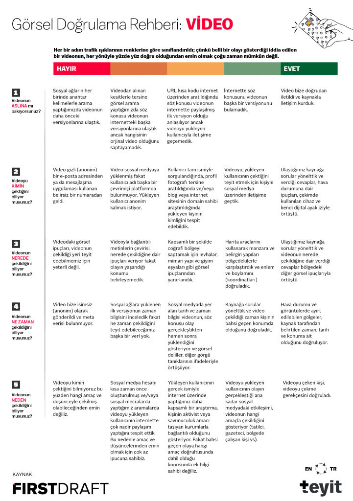 Görsellerde olduğu gibi videolarda da kolaylıkla değişiklik yapılabilmektedir. Özellikle, kullanıcı üretimi videolar orijinal biçimlerinde görünmeyebilirler (Browne, t.y., s. 47). Videoların doğrulanmasında da tıpkı görsellerde olduğu gibi aşağıdaki beş soruya odaklanarak cevaplara ulaşmak mümkündür (Urbani, 2019):